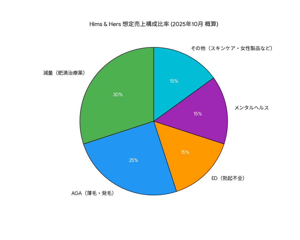 | その他(スキンケア・女性製品など) | 15% | ニキビ治療薬、避妊薬(ピル)、その他の女性向け製品(Hers) |