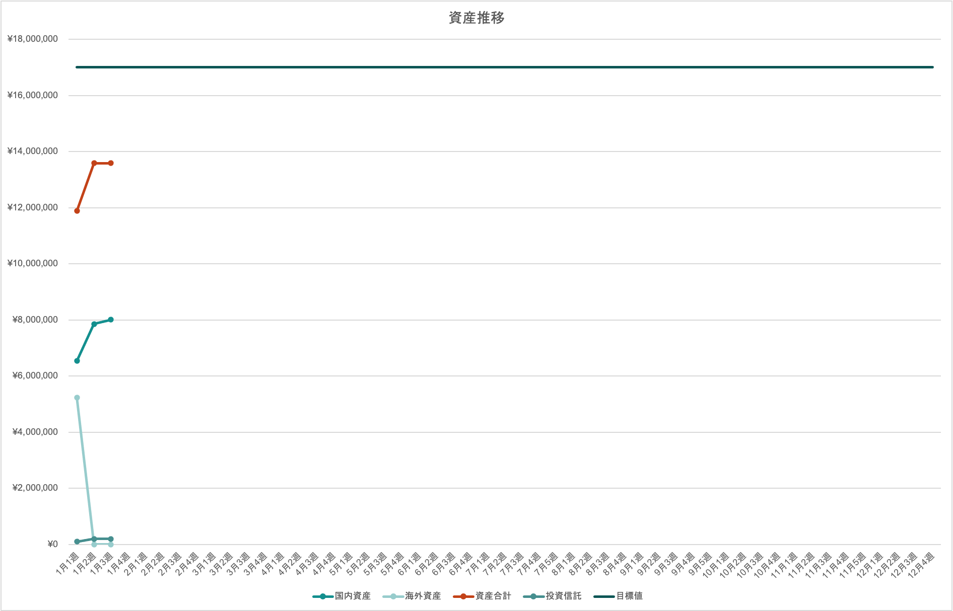 | 国内資産 | 海外資産 | 資産合計 | 目標値 | 目標までの不足額 | |