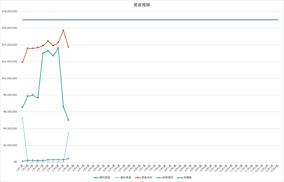 | 国内資産 | 海外資産 | 資産合計 | 目標値 | 目標までの不足額 | |